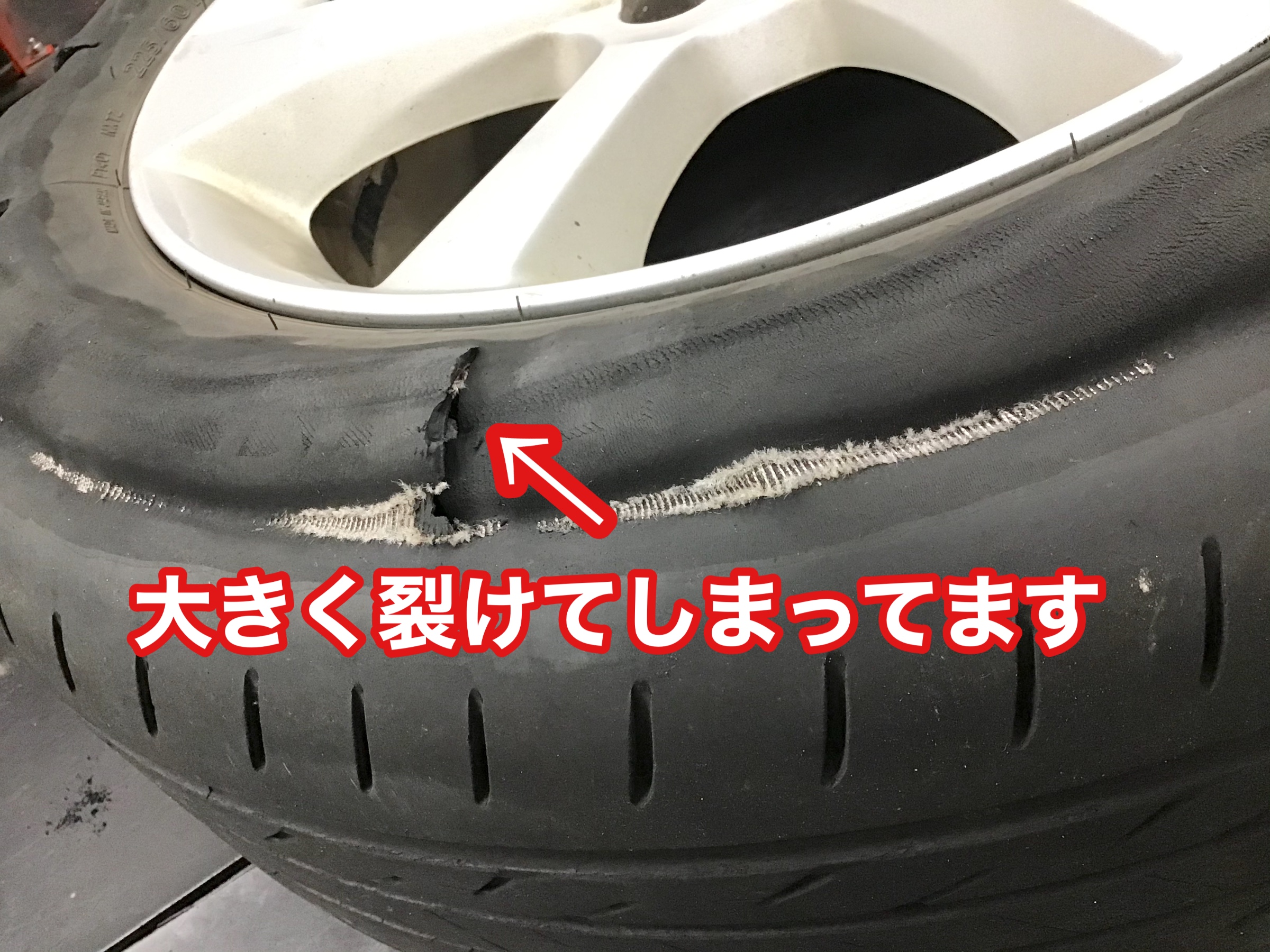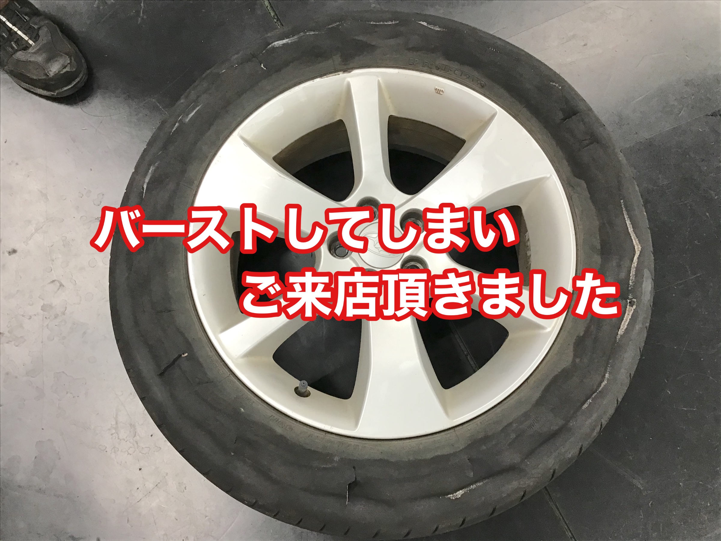 スローパンクが原因でバーストした状態のタイヤ