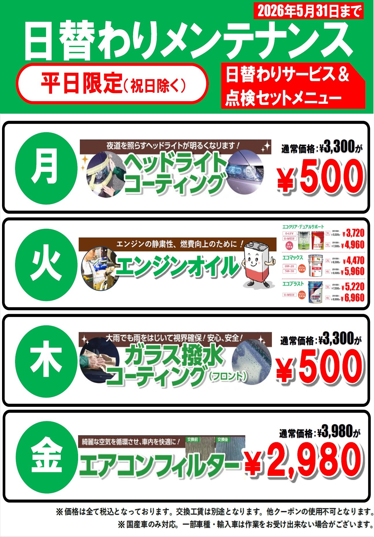 ☆平日限定日替りメンテナンス☆ ポスト 2026年3月29日 「平日限定」日替わりメンテナンスのおしらせです 月曜日から金曜日までの平日限定で、おクルマのメンテナンスが店頭価格より お安くご利用いただけます♪ さらにお得なメンテナンスパックもご用意しておりますので、 お得なこの機会をぜひご利用くださいませ♪ ※定休日や祝日は除かせていただきます。