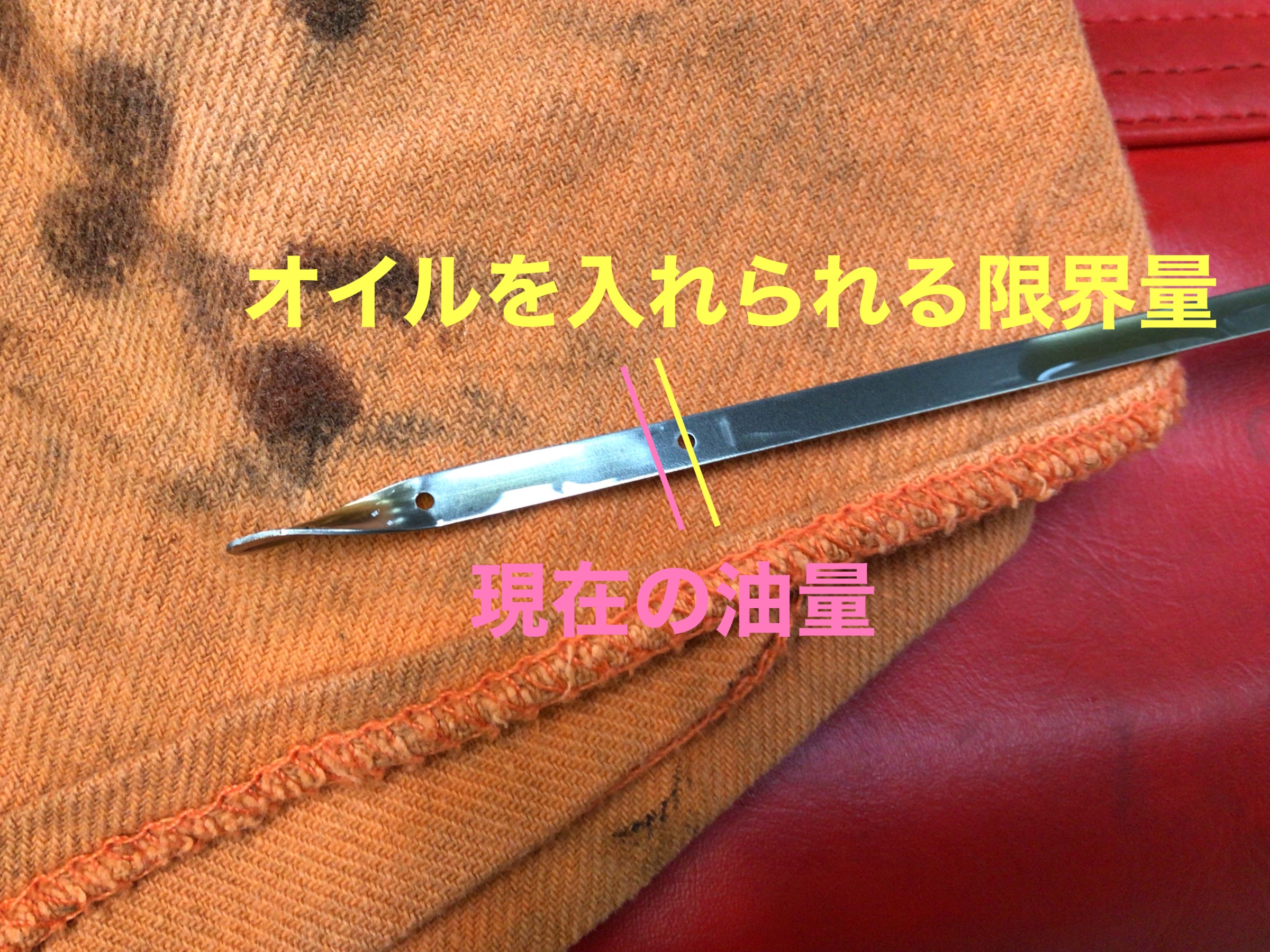エンジンをかけてオイルを循環させた後、油量を確認します。