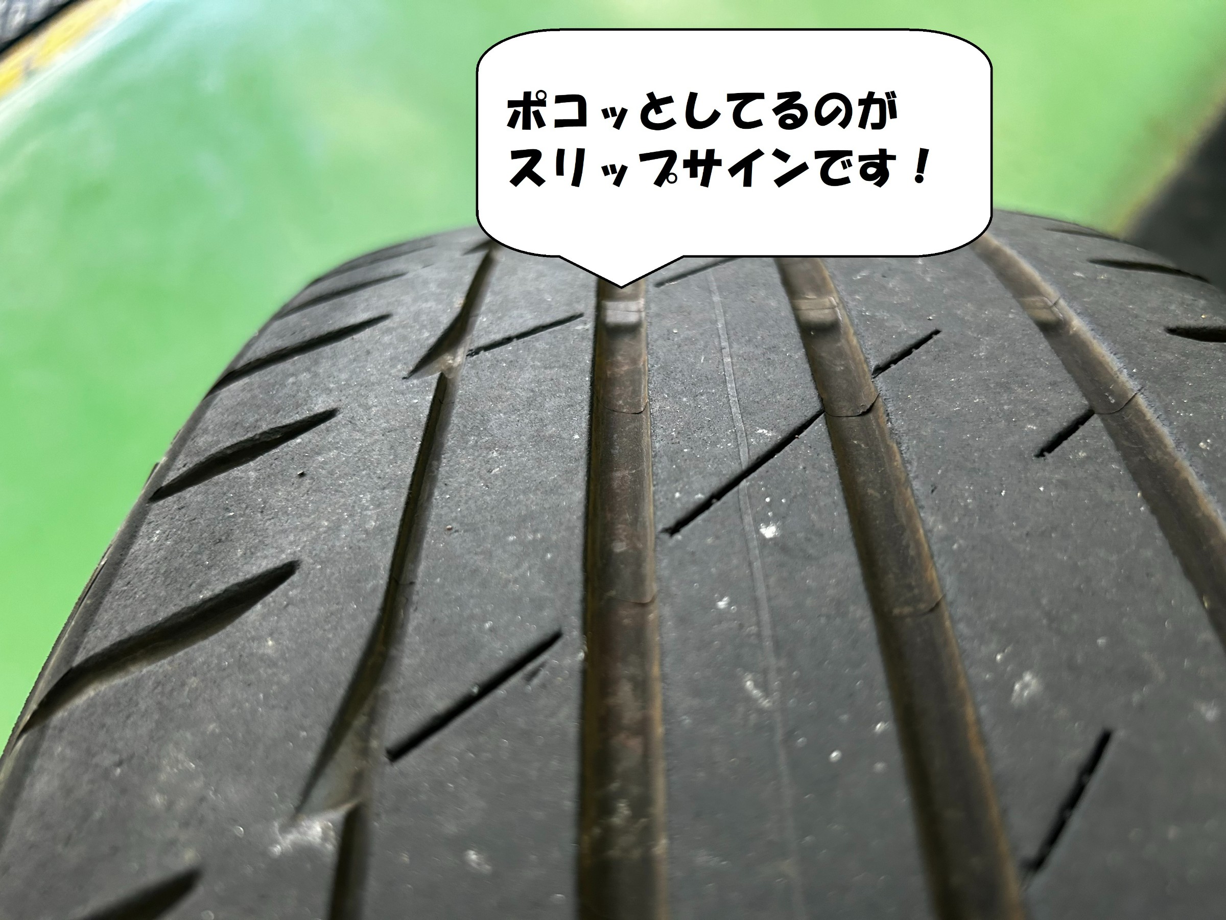 実際使える溝としてはスリップサインまでの分ですので使える溝は1.5~2.5mm位となっていますので交換時期としてはちょうどいい感じですね!