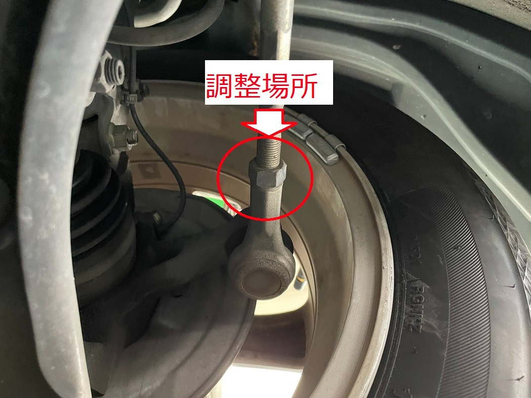 お車の下に潜るとこういった調整をする為の場所があるのでこの棒を伸ばしたり縮めたりする事で取り付けの角度を調整していきます♪