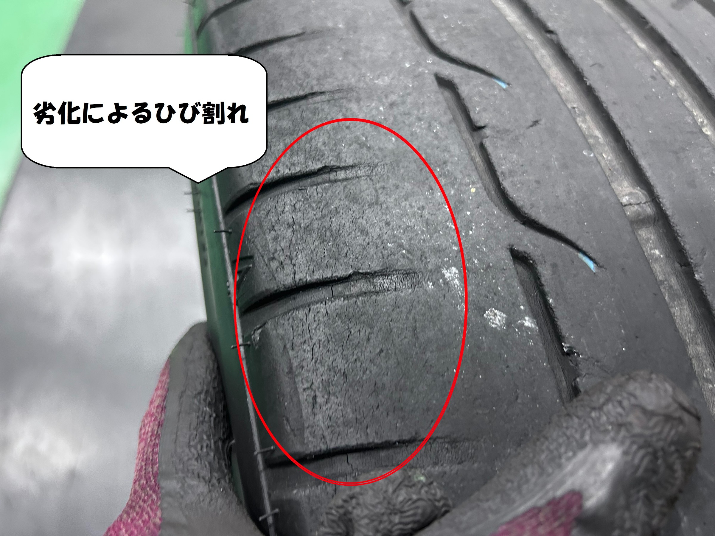 実際にタイヤを見てみるとまだ溝はあるものの年数が経ちタイヤにひび割れが表れていることをお伝えさせて頂き交換させていただきました