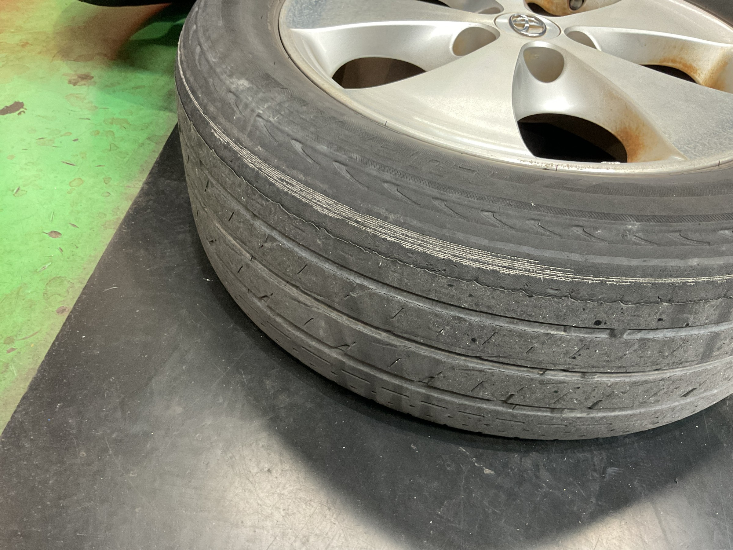 交換前のタイヤはタイヤのワイヤーが出ていたり、接地面のゴムが剝がれてきていますね。。
