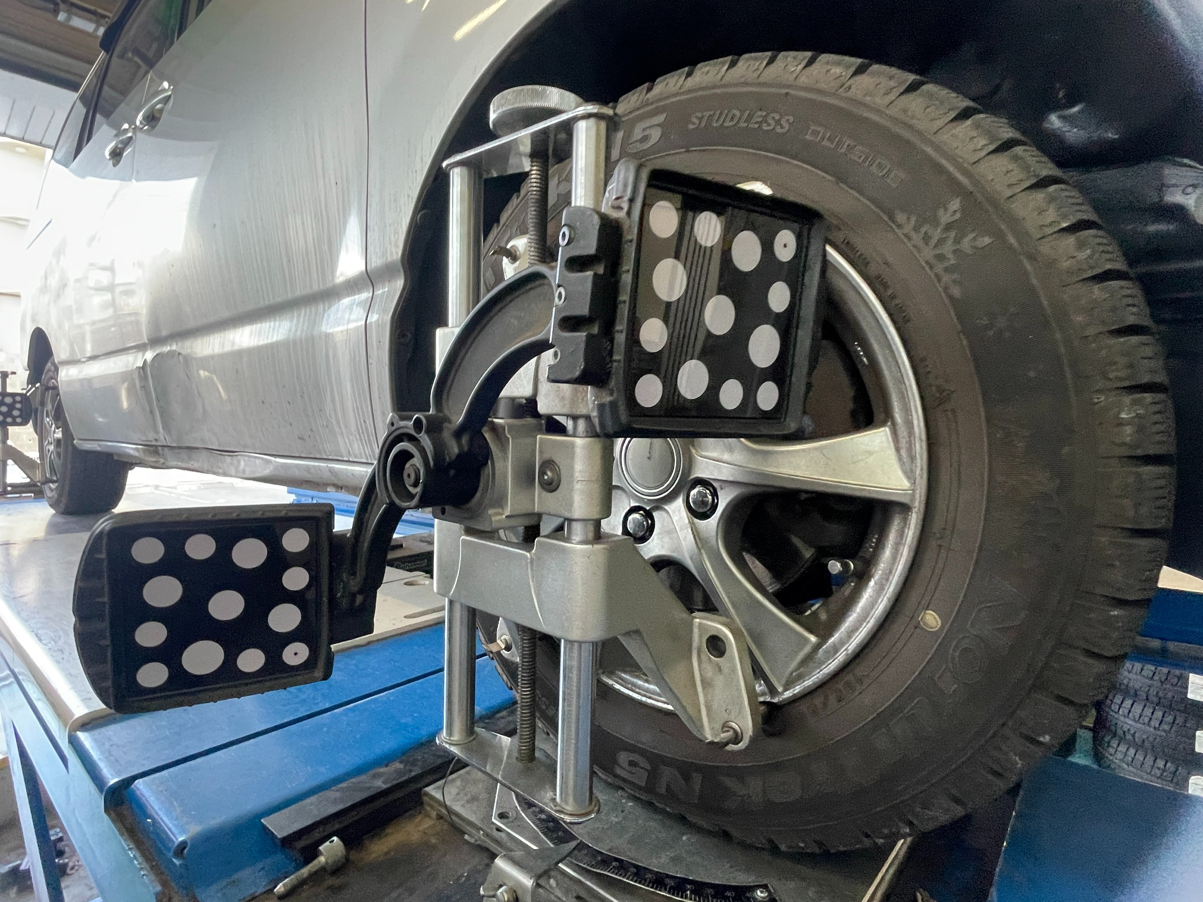 ・いろいろとお話をうかがうと、まっすぐ走っているのにハンドルが左右どちらに傾く、ステアリングセンターがずれている状態だったため、アライメント測定・調整を行いました。