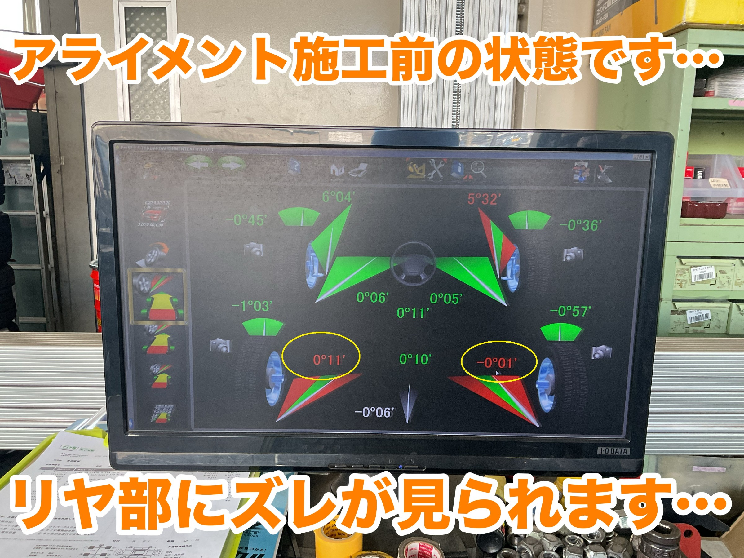 リヤ部の『トー数値』にズレが見られますので調整を行います。(黄色〇印)