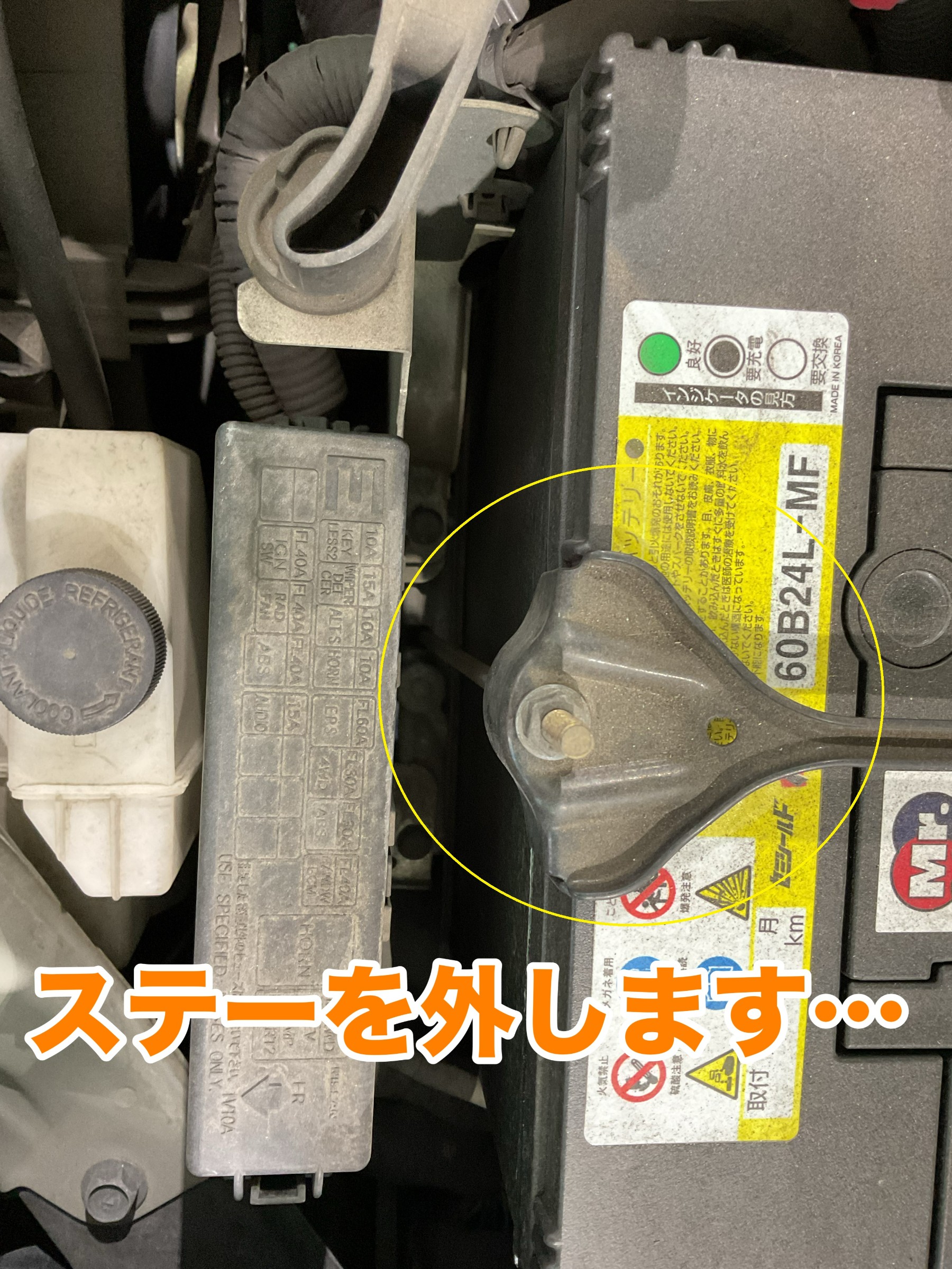 ↓↓↓ バッテリー本体を固定している ステーを外します。(黄色〇印)