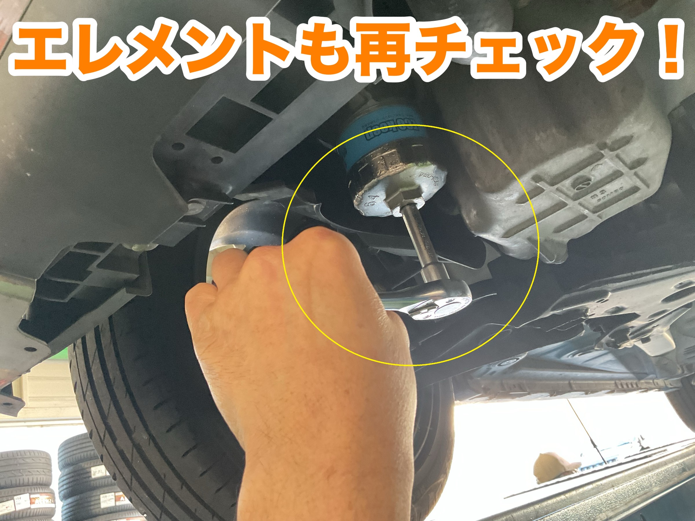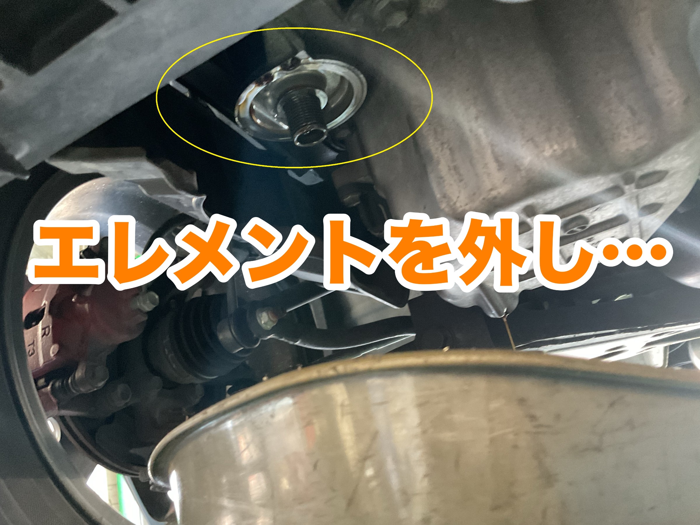 ↓↓↓ 車両をリフトアップし『オイルエレメント』を外します。(黄色〇印)
