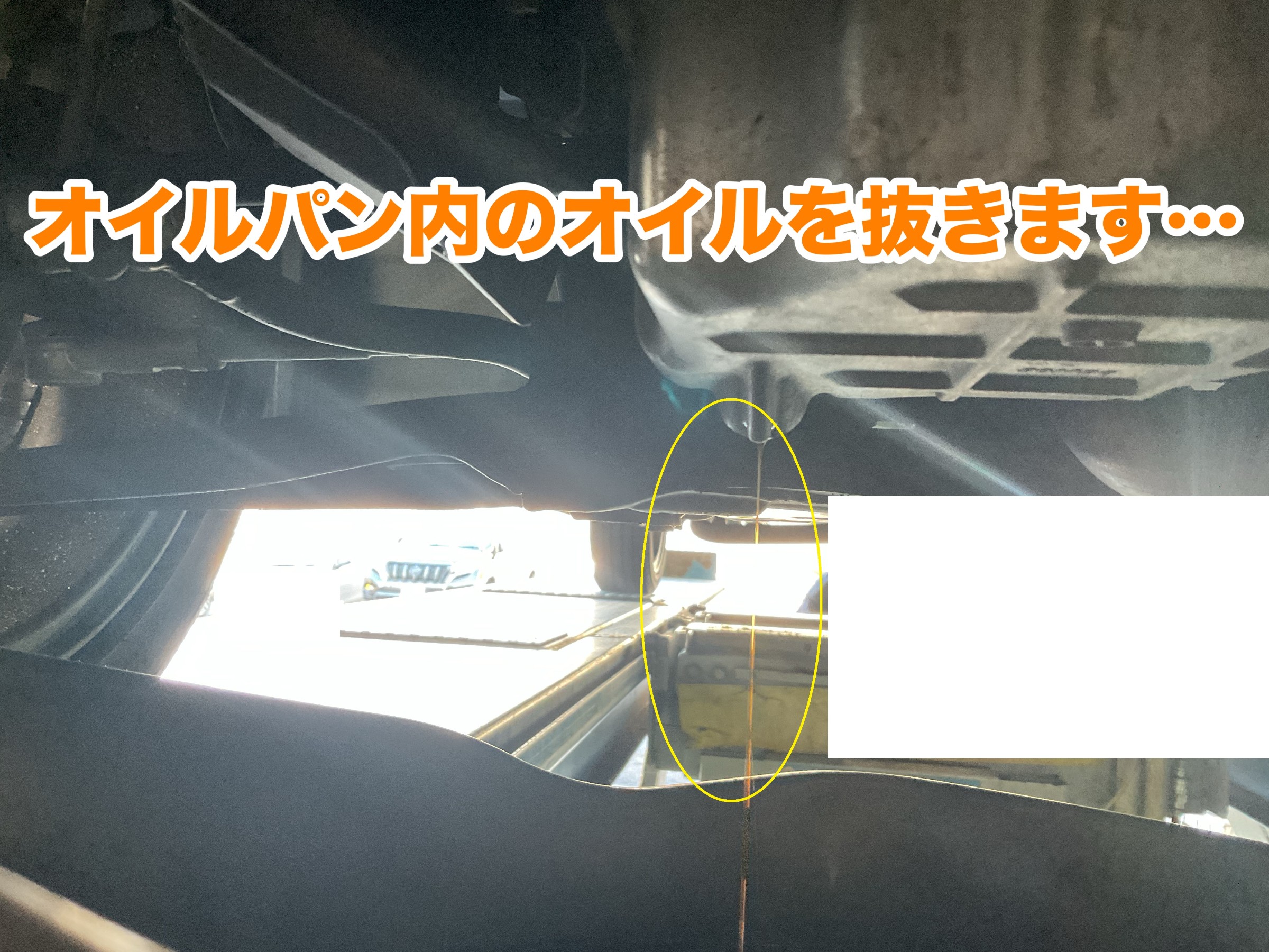 ↓↓↓ オイルパン内のエンジンオイルを抜いていきます。(黄色〇印)