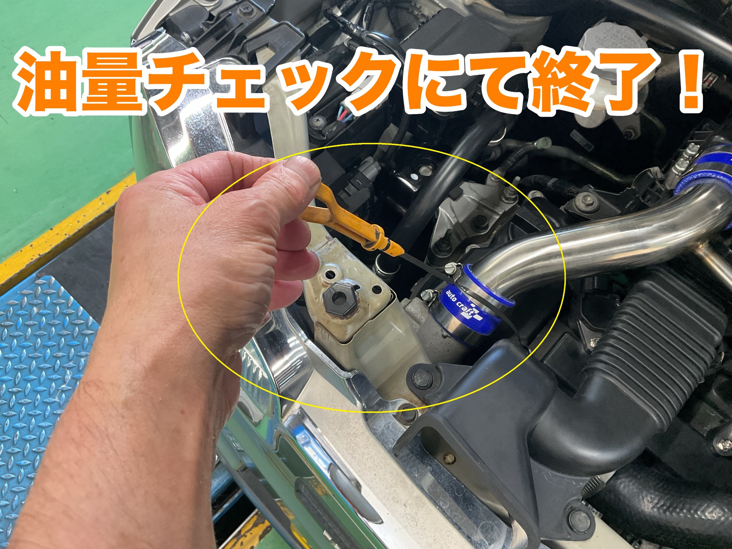 ↓↓↓ 最後に『レベルゲージ』にて油量を確認の上 作業終了となります。(黄色〇印)