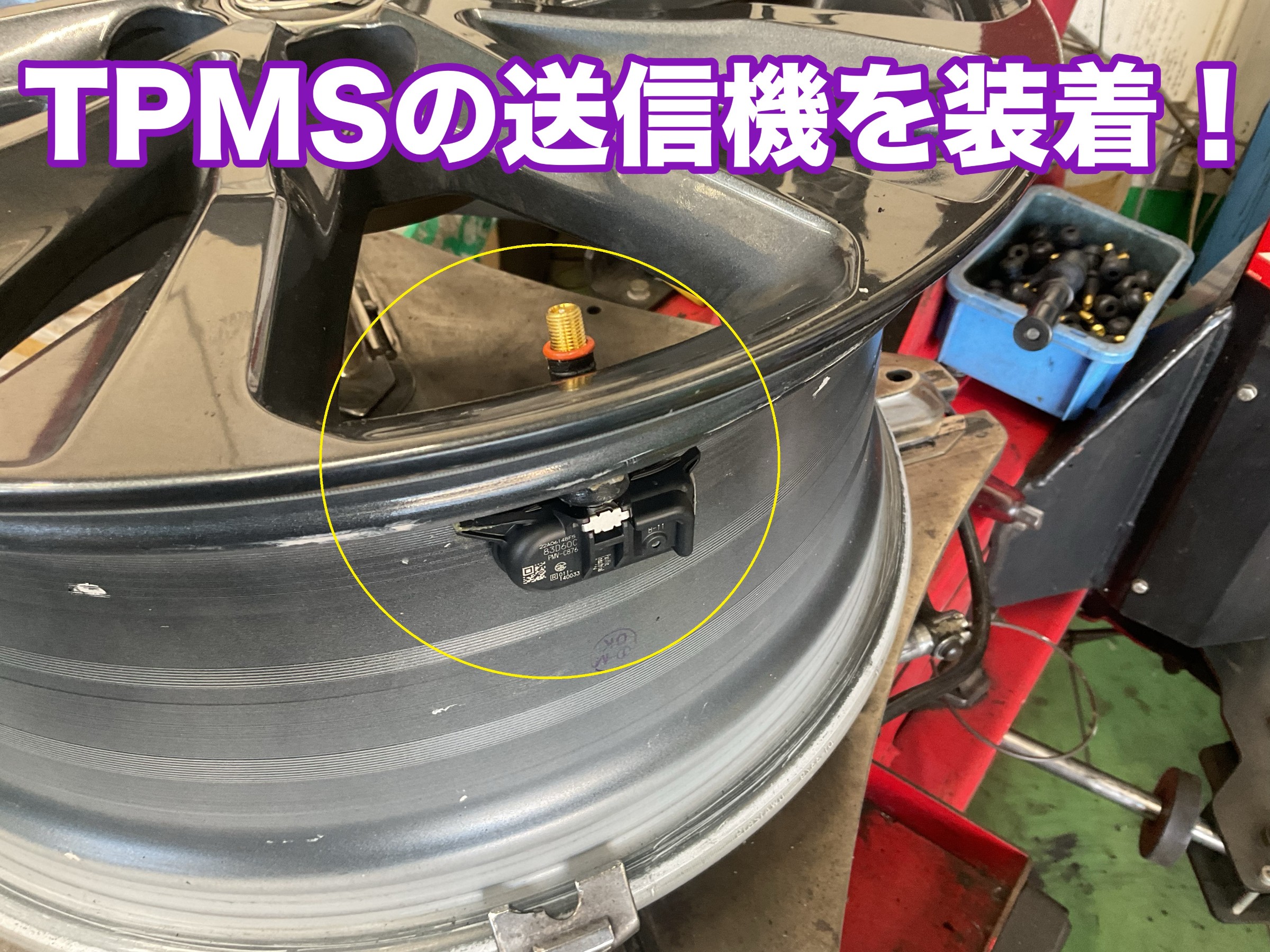 送信機部を ホイールに装着致します。(黄色〇印)