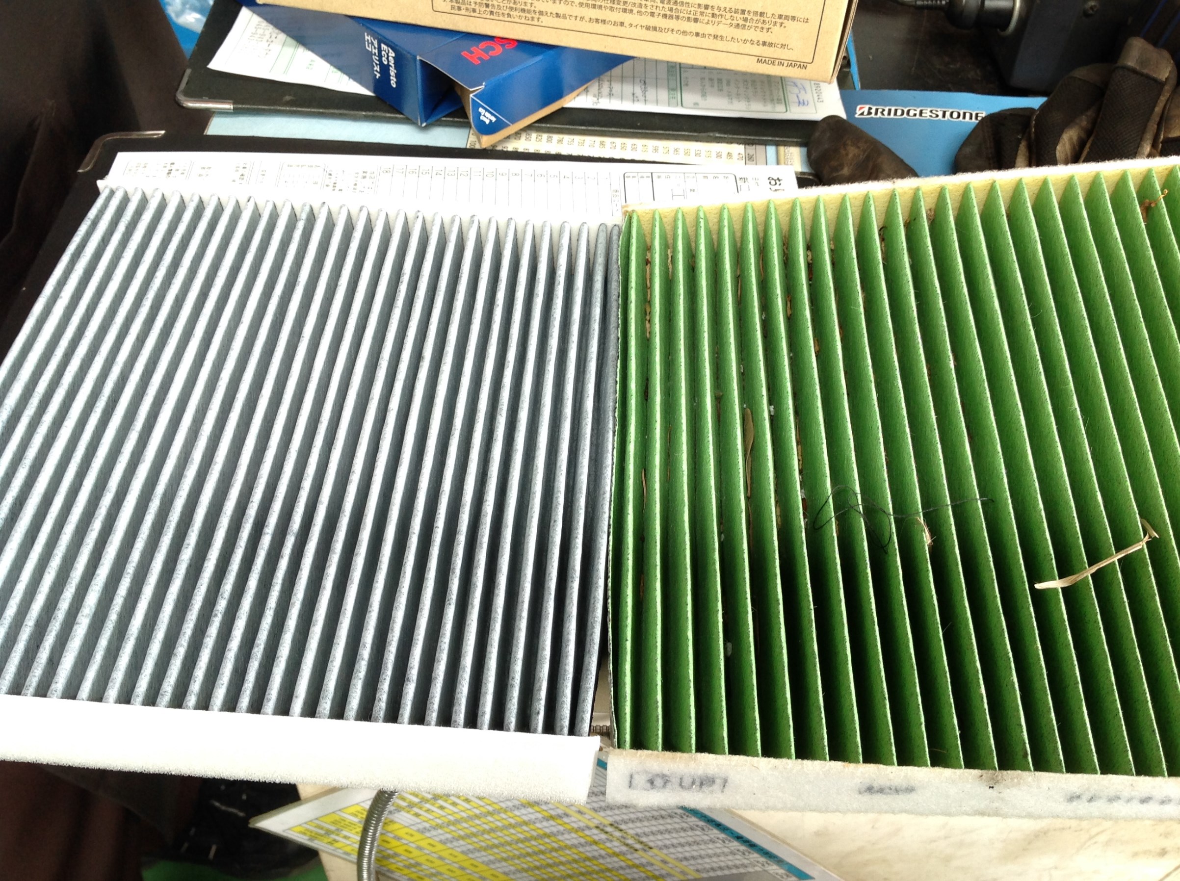 カローラフィールダー エアコンフィルター交換 ポスト 2018年7月22日 オイル交換時に安全点検をさせて頂いたところエアコンフィルターがかなり汚れていました。 右側の緑色のフィルターが使用中のもので左側が新品のものです。 落ち葉や埃などが沢山挟まっていますΣ(|||▽||| ) ニオイやアレルギーの原因になりますので1年に1回は交換しましょう!