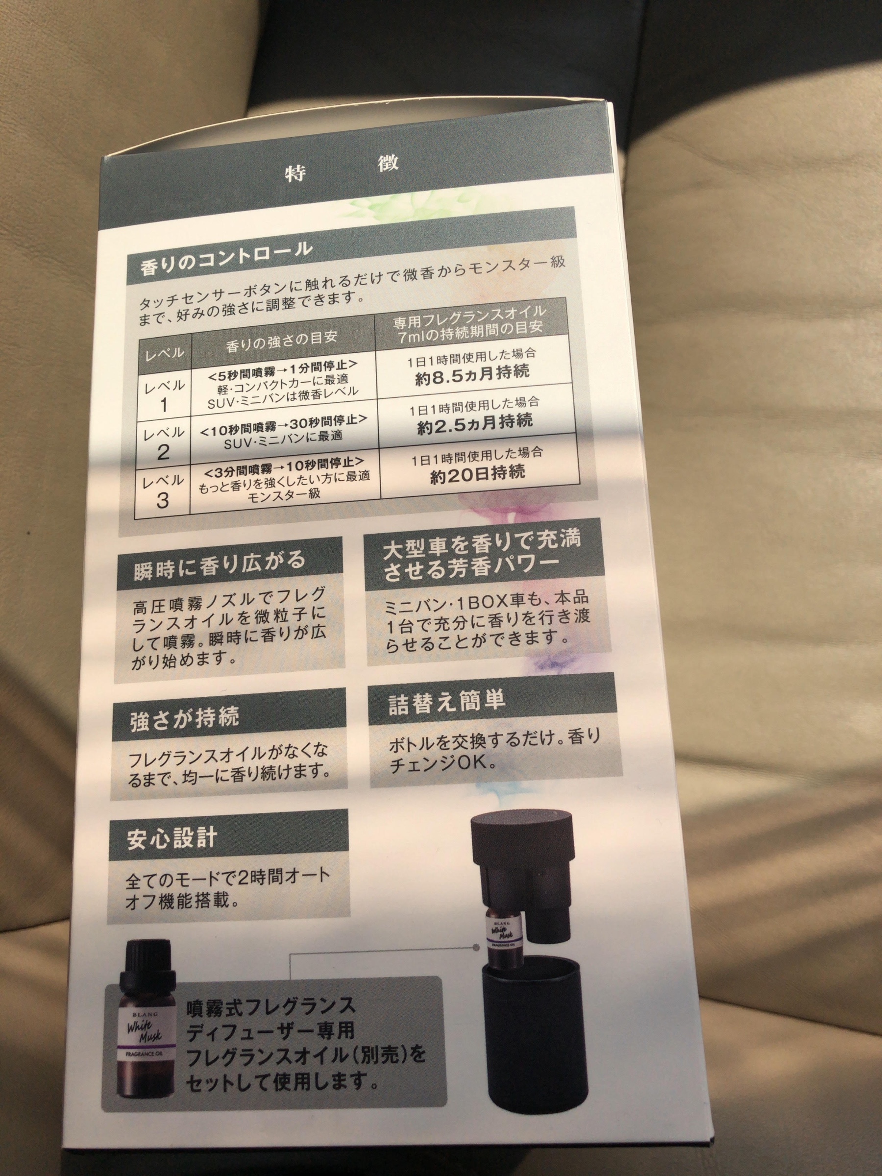芳香剤2♪ ポスト 2020年4月29日 こんにちは! タイヤ館港北ニュータウン店です。 今回は前回に続き芳香剤の紹介をします BLANGシリーズのUSBを使用するタイプの芳香剤です 本体はこんな感じでアレクサに似てます 本体に付ける詰め替えのリキッドは特濃と書いてあったので気になって購入しました。 匂いは王道のホワイトムスクです!! 使い方は簡単で電源ボタンを押すだけです 匂いはレベルに応じて調整できるのでキツい匂いが苦手な人にもオススメです