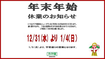 皆様、こんにちは! いつも神奈川県 横浜市 都筑区 タイヤ館 港北ニュータウン店のWebを御覧の皆様ありがとうございます♪ タイヤ館は、あなたの町の "タイヤ専門店"です。 タイヤ館港北ニュータウン店では下記の期間を年末年始の休業とさせていただきます。 お客様にはご不便をおかけいたしますが何...