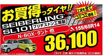 みなさま、こんにちは! 空気も冷たくなり、気温の下がる日も増えましたね。 師走に向けて、色々と出費が増える時期にもなります。。。 そこで!! ¥ブリヂストン工場生産品である… SEIBERLING(セイバーリング)SL101 軽自動車用 & コンパクト車用の2サイズ 主力2サイズをコミコミお買い得価格...