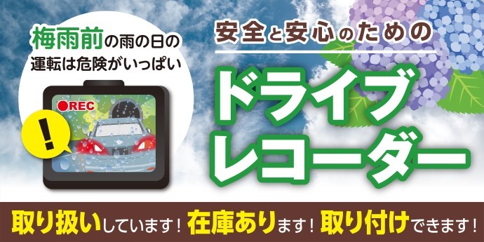 梅雨です。 ドライブレコーダーつけませんか? ポスト 2020年6月14日 もう梅雨入りですね。 雨降りは視界が悪く危険がいっぱい。 自分は安全点検していても...。 もし万が一という時、ドライブレコーダーが付いていれば 強い味方となってくれますよね。 タイヤ館では、常時4~5種類の在庫をしております。 梅雨前に取付いかがですか? ご相談だけでもどうぞご来店ください。 担当:坪内