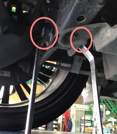 写真の丸で囲った部分の偏心カムを動かしてトウの調整をします。
