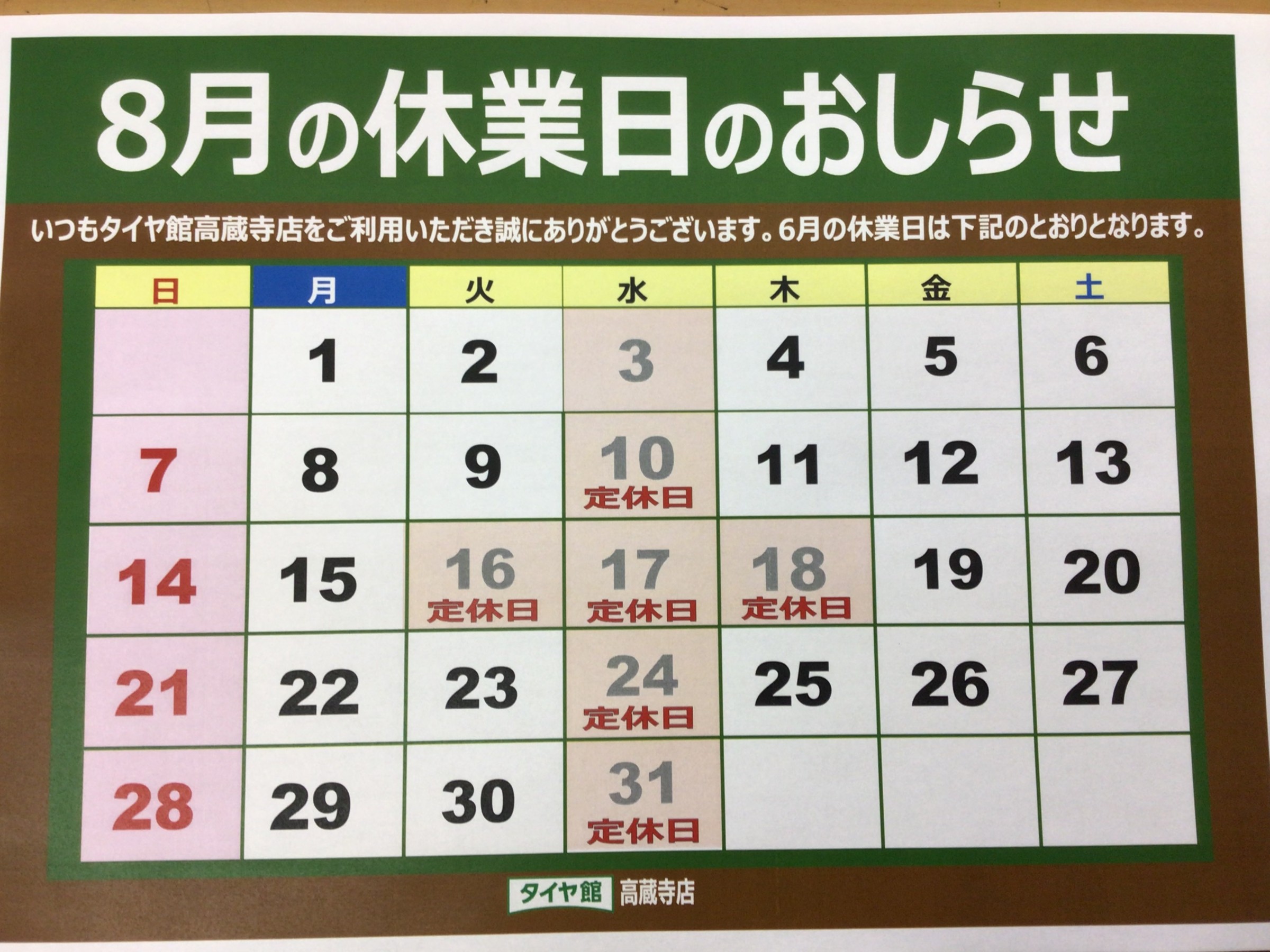 8月の定休日のご案内 ポスト 2022年7月31日 こんにちは、愛知県春日井市にある タイヤ館高蔵寺です。 ご近所の春日井市だけでなく、名古屋市守山区、小牧市、尾張旭市、瀬戸市、岐阜県多治見市などからもご来店いただきまして、ありがとうございます! 8月度の休みについてご報告させていただきます。 詳しくは下記図をご確認ください。 カテゴリ:お知らせ