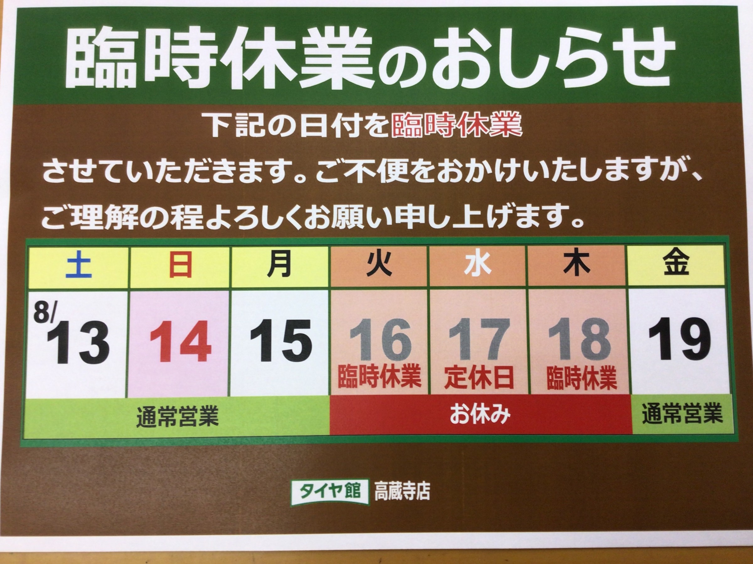 臨時休業のお知らせ ポスト 2022年8月9日 こんにちは、愛知県春日井市にある タイヤ館高蔵寺です。 ご近所の春日井市だけでなく、名古屋市守山区、小牧市、尾張旭市、瀬戸市、岐阜県多治見市などからもご来店いただきまして、ありがとうございます! 8月16日(火)・17日(水)・18日(木)は、臨時休業をいただきます。 なお、8月18日(木)は、タイヤ館辻本通店・タイヤ館鳴海店・タイヤ館焼山店は営業しております。 お客様にはご迷惑をおかけいたしますが、ご理解とご協力をよろしくお願いいたします。 カテゴリ:お知らせ