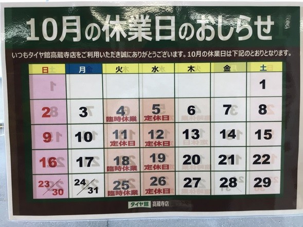 タイヤ館高蔵寺店は10月1日より定休日が毎週火曜日・水曜日に変更となります。