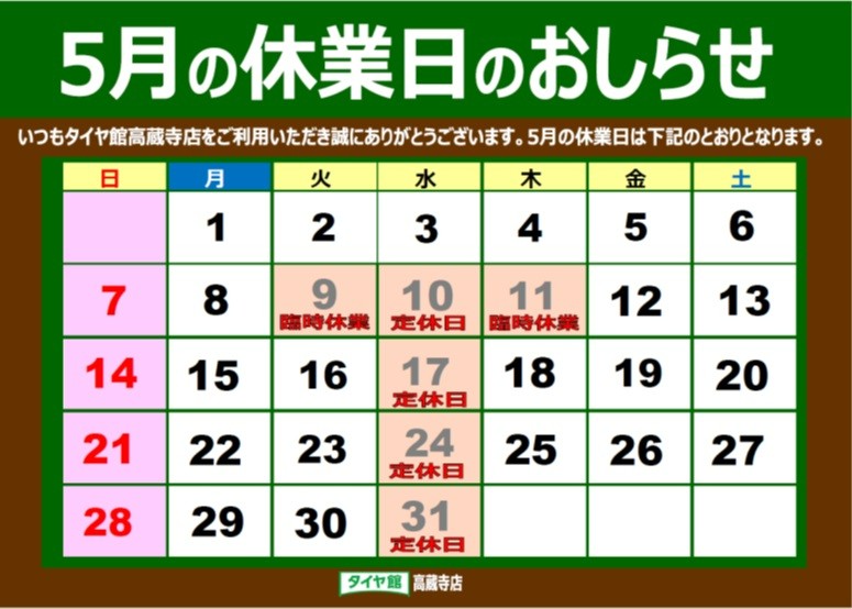 ◆◆ 5月の定休日のご案内 ◆◆ ポスト 2023年5月1日 こんにちは、愛知県春日井市にある タイヤ館高蔵寺です。 ご近所の春日井市だけでなく、名古屋市守山区、小牧市、尾張旭市、瀬戸市、岐阜県多治見市などからもご来店いただきまして、ありがとうございます! [タイヤ館高蔵寺アクセスMAP] ↓ アクセスマップ タイヤ館高蔵寺 5月度の休みについてご報告させていただきます。 詳しくは下記図をご確認ください。 カテゴリ:お知らせ