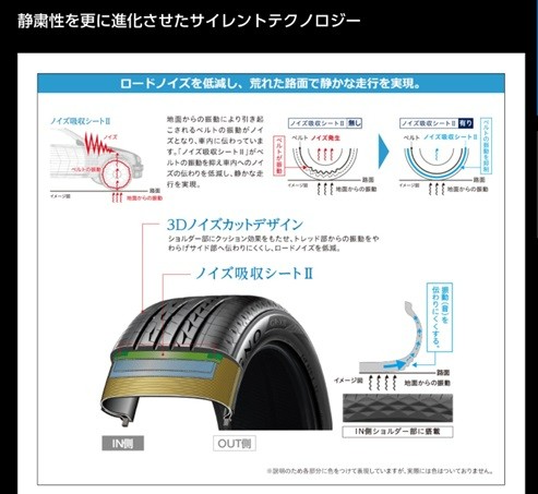 ブリヂストンの一部のプレミアムタイヤに使われている技術採用で優雅な乗り心地を演出しています。
