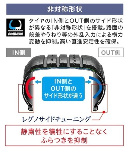 タイヤのIN側とOUT側のサイド形状が異なる「非対称形状」を採用し、路面の段差やうねり等の外乱入力による応力変動を抑制し、高い直進安定性を確保します。また「非対称パタン」は、IN側にサイプ基調のショルダーブロックを採用し静粛性を向上させ、OUT側に高剛性ブロックを配置することで剛性を高め、高い操縦安定性と直進安定性を確保し、優雅な乗り心地と高い運動性能を両立しています。