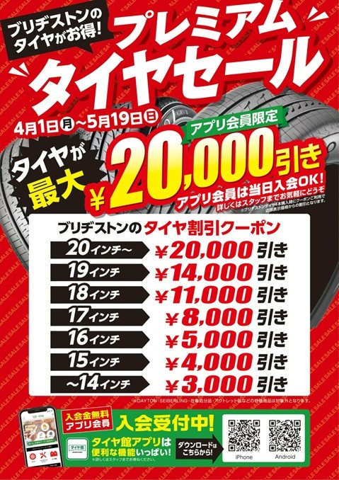 4/1~5/19までに「タイヤ館アプリ」をダウンロードして、クーポンをゲットすること