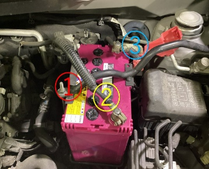 ③プラス端子→②マイナス端子の順番で取り付ける ▼