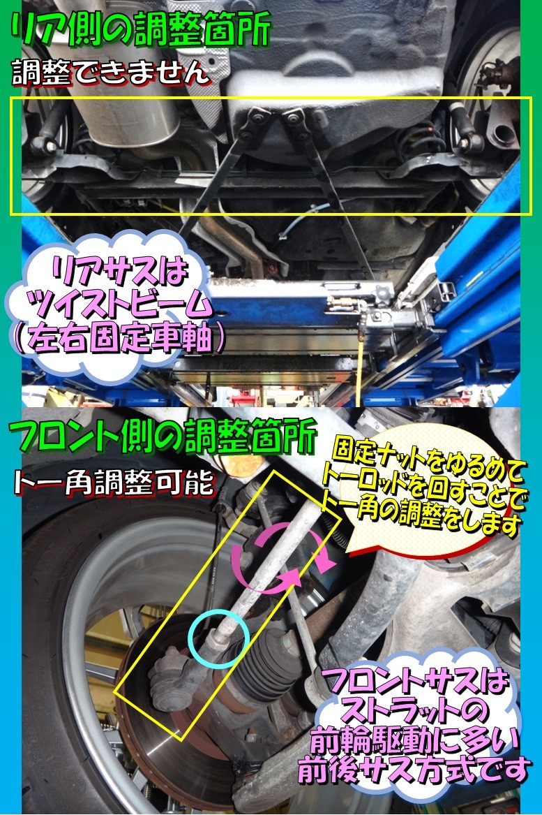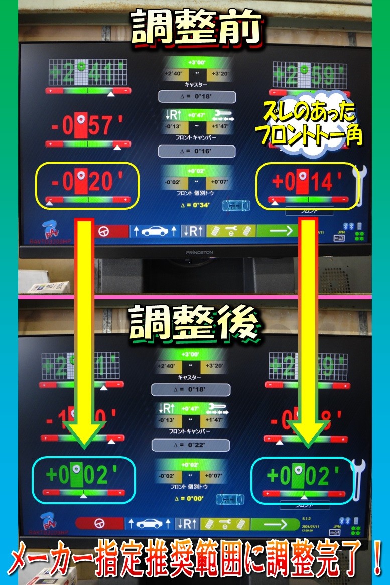 結果、調整が効くポイントでは「フロントトー角」が大きくずれていますね。。