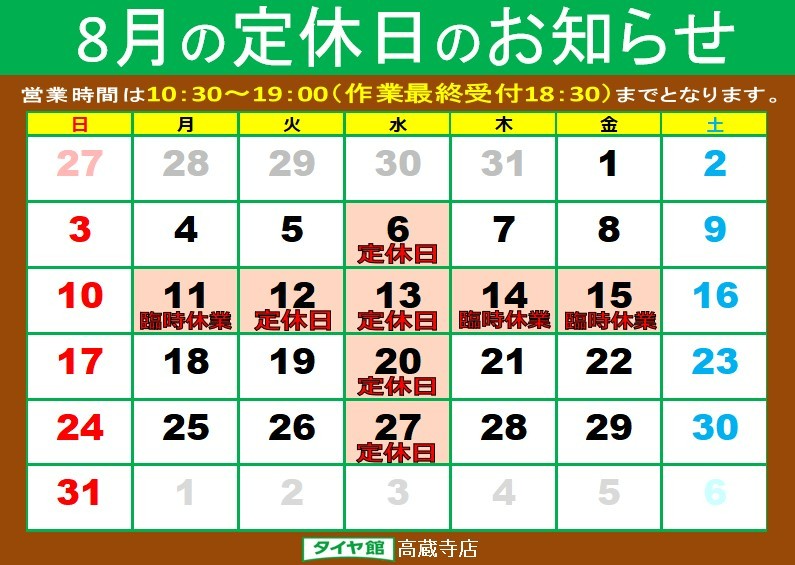 ◆◆ 8月定休日のご案内 ◆◆