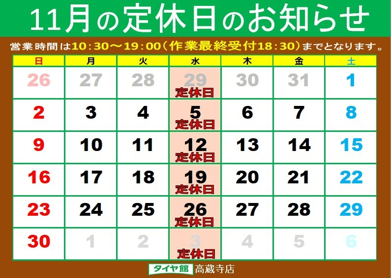 ◆◆ 11月定休日のご案内 ◆◆