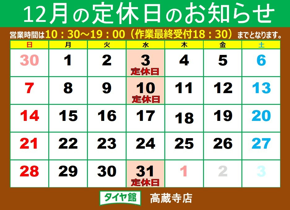 ◆◆ 12月定休日のご案内 ◆◆