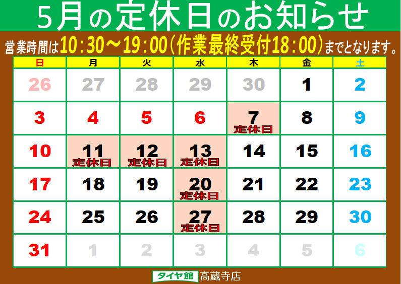 5月は7日,11日、12日、13日、20日,27日がお休みとなります。