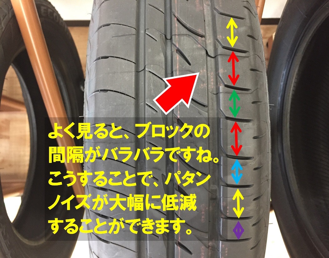 これは「バリアブルピッチ配列」といって、これがもし等間隔で刻まれているとタイヤが回転するときにピッチ長に同じであれば、そのピッチ長で発生する周波数成分が際立ってしまい、とても耳障りなパタンレベルが発生してしまいます。