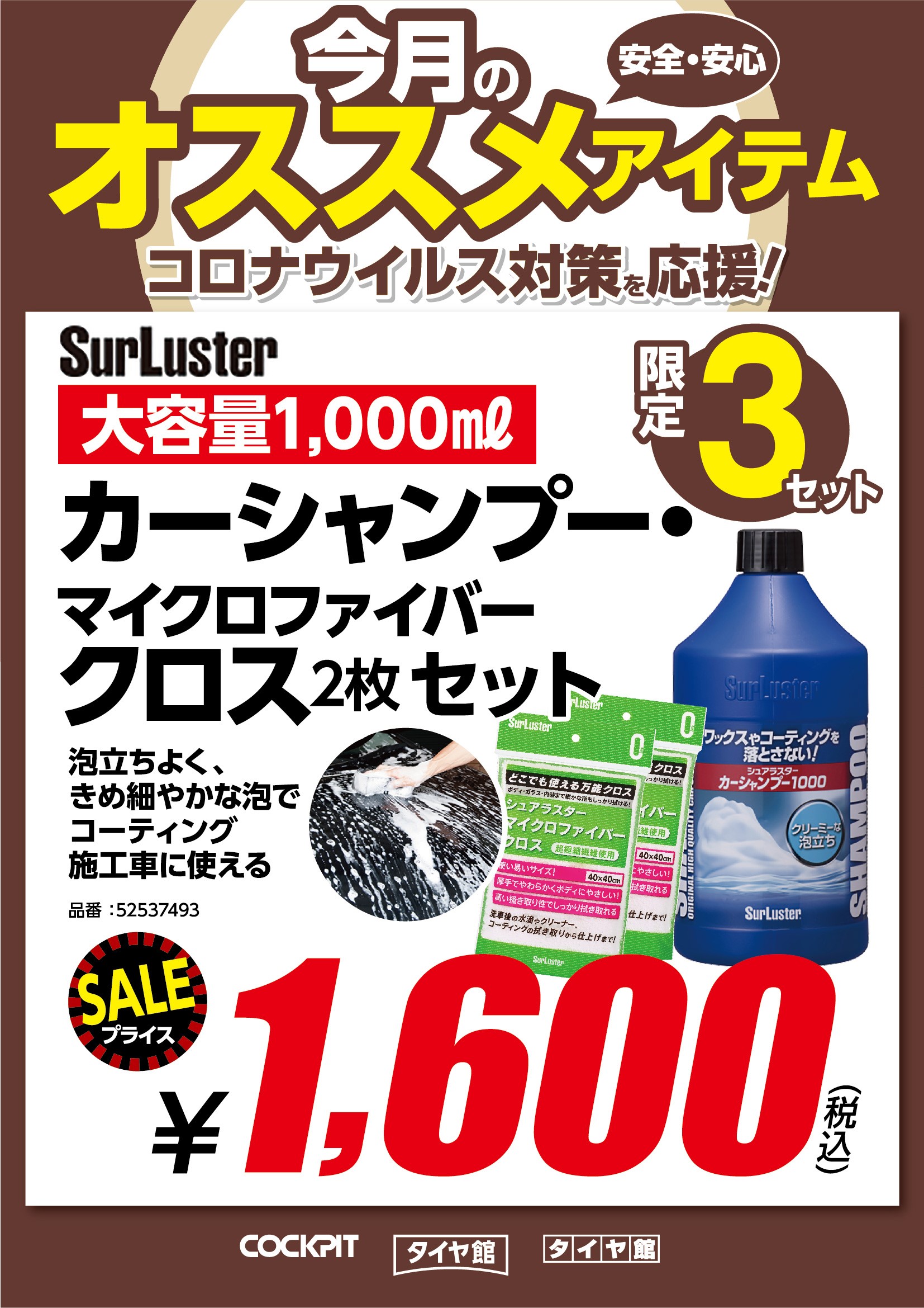 5月 オススメアイテムご紹介 ポスト 2020年5月9日 愛知県 春日井市小牧市守山区 岐阜県多治見市その他近隣のお客様 こんにちは。愛知県春日井市出川町のタイヤ館高蔵寺です。 HPをご覧頂きありがとうございます! 今月のオススメアイテムです(^^♪ 洗車でお車を綺麗にして車内空間もウイルス対策を万全にしてみてはいかがですか? 2点同時購入の場合は割引の価格になります! カテゴリ:その他メンテナンス 担当:せきぐち