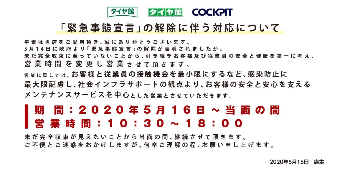 「緊急事態宣言」の解除に伴う営業時間変更のお知らせ