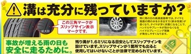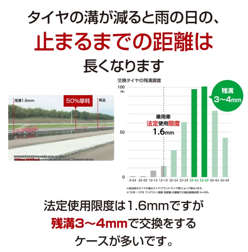 タイヤの溝が少ないままでの雨の日では、止まるまでの距離が・・・・。