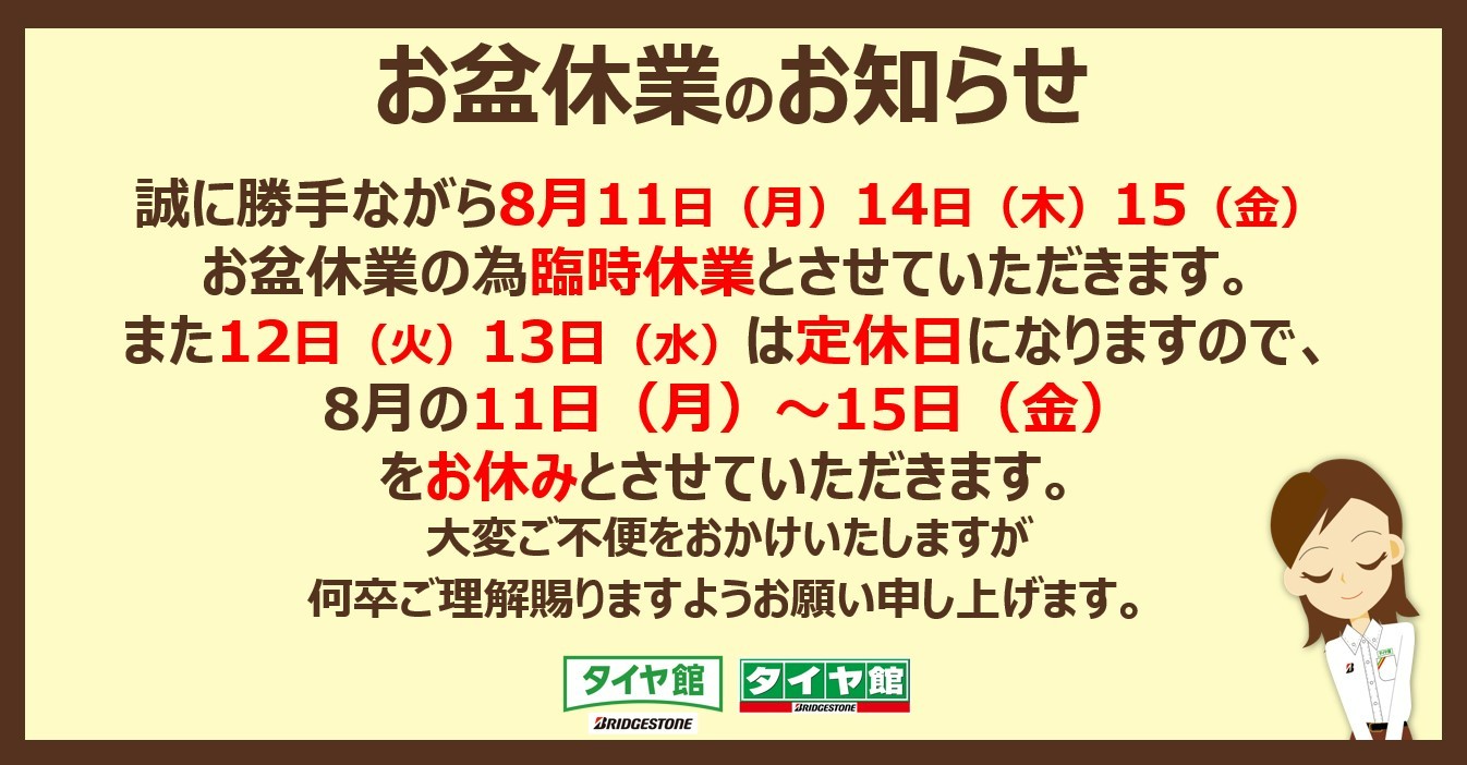 いつも当店HPを ご覧いただきありがとうございます。 タイヤ館アプリダウンロードでお得にタイヤGET‼ こちらから 今年もすごく暑いですね! これからのシーズン夏休みやお盆で お出かけをご予定されている方も いらっしゃると思いますが お出かけ前にお車の点検はもうお済みでしょうか? タイヤ館の...