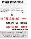 ホームページをご覧の皆様、こんにちは! 7/21 金曜日は臨時休業となります。 ご了承くださいませ。