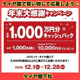 コクピット・タイヤ館にて1会計につき 5,000円(税抜)以上のご購入でご応募いただけます!コクピット・タイヤ館年末大感謝キャンペーン開催!