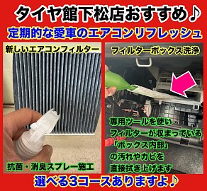 皆さまは愛車のエアコンフィルター点検されていますか?タイヤ館下松店ではエアコンフィルター交換と一緒にエアコンリフレッシュおすすめですよ。