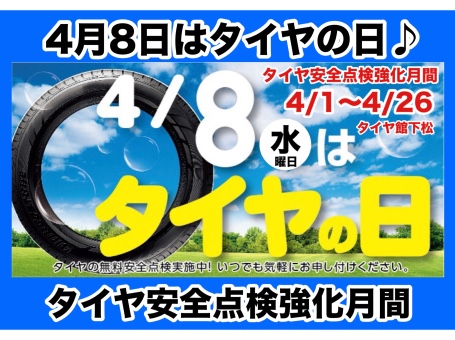4月8日は…タイヤの日ですよ。 4/1〜4/26までタイヤ安全点検強化月間活動中。
