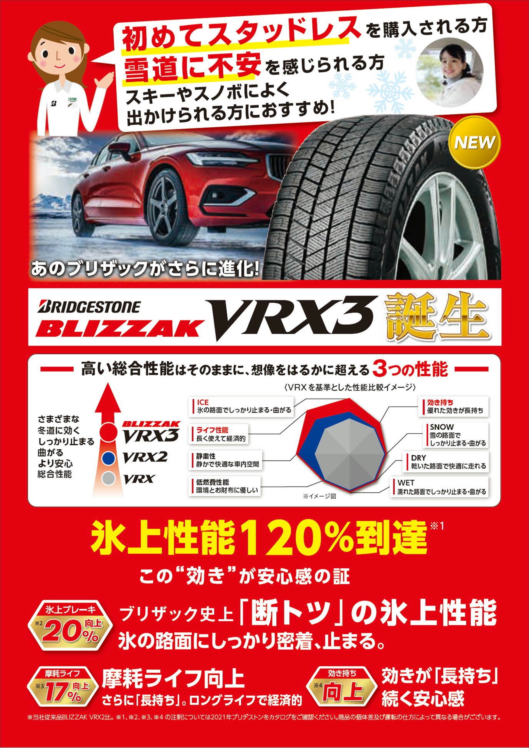 BLIZZAK VRX3 ポスト VRX2が進化して新登場!! 氷上ブレーキ性能が20%アップ。 あのVRX2と比較してもさらにしっかり曲がり、さらにしっかり止まる!! 摩耗ライフ、17%向上!! 約1シーズン長持ちします。 そしてより効きが長持ち!! 関連情報もあわせてご覧ください BLIZZAK VRX3 カテゴリ:商品情報 タイヤ関連