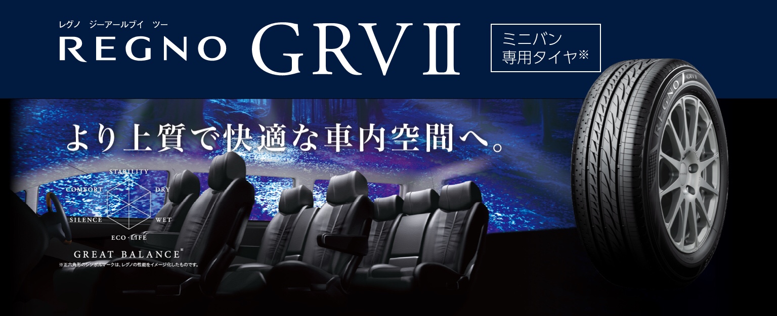 そして「REGNO」のミニバン専用タイヤ「REGNO GRVⅡ(レグノ ジーアールブイツー)」は、ミニバン特有のふらつきを抑制するだけでなく、広い車内空間での高い静粛性と優れた乗り心地を実現したプレミアムタイヤなのです。