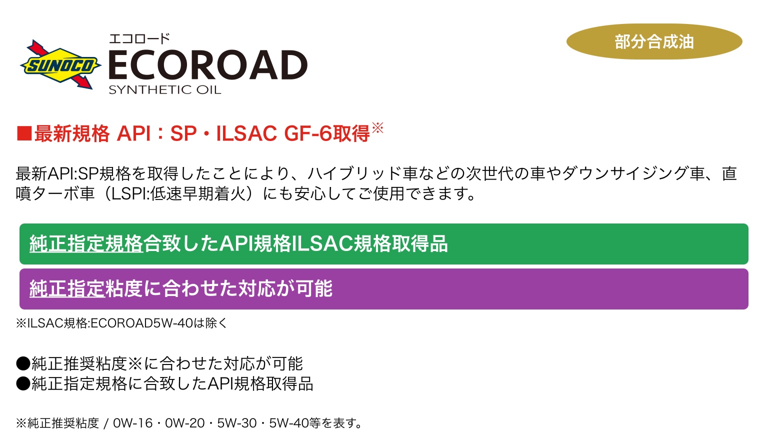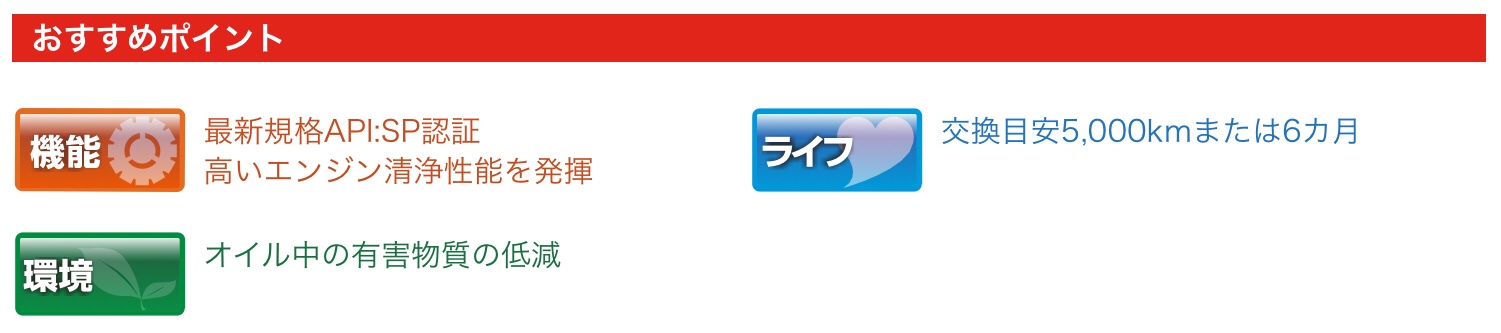 最新API:SP規格を取得したことにより、ハイブリッド車などの次世代の車やダウンサイジング車、直噴ターボ車(LSPI:低速早期着火)にも安心してご使用できます。
