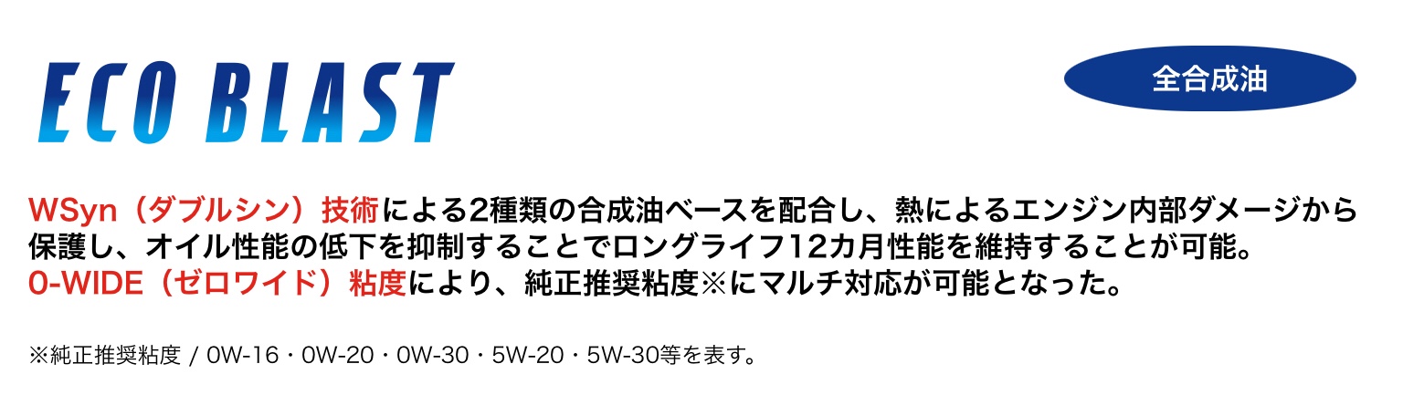 ◆エコブラスト◆ ポスト WSyn(ダブルシン)技術による2種類の合成油ベースを配合し、熱によるエンジン内部ダメージから保護し、オイル性能の低下を抑制することでロングライフ12カ月性能を維持することが可能。 0-WIDE(ゼロワイド)粘度により、純正推奨粘度※にマルチ対応が可能となった。 ※純正推奨粘度 / 0W-16・0W-20・0W-30・5W-20・5W-30等を表す。 カテゴリ:商品情報 その他メンテナンス