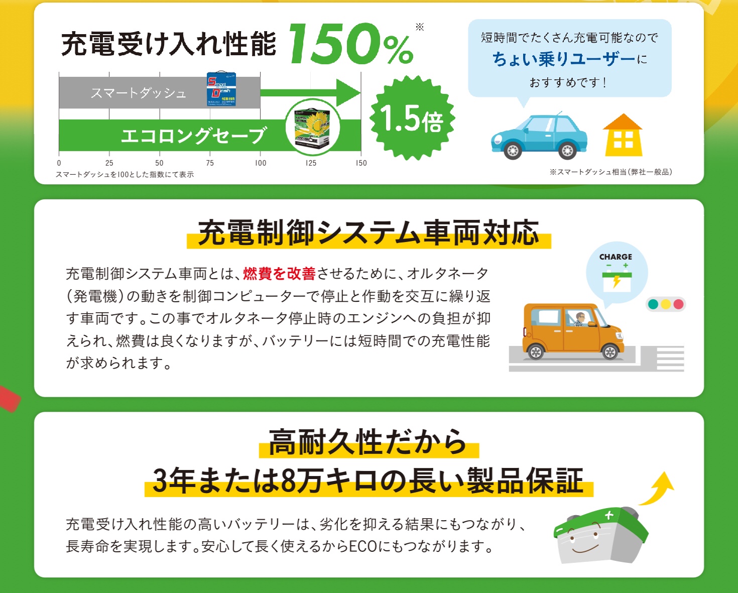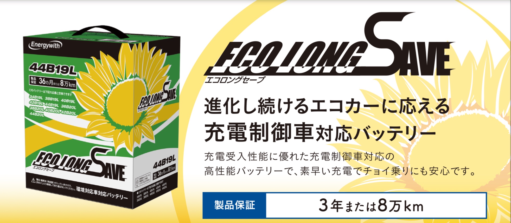 ▶︎エナジーウィズさんの充電制御車対応バッテリー エコロングセーブ ポスト 進化し続けるエコカーに応える 充電制御車対応バッテリー 充電受入性能に優れた充電制御車対応の 高性能バッテリーで、素早い充電でチョイ乗りにも安心です。 製品保証 3年または8万km 関連情報もあわせてご覧ください →エナジーウィズさんのホームページ →エナジーウィズさんのバッテリー適合検索 カテゴリ:商品情報 その他メンテナンス