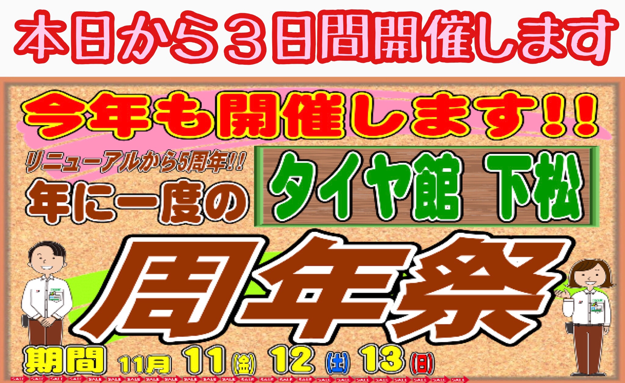 周年祭…本日から3日間開催します♪ ポスト 2022年11月11日 今年も開催します♪ 周年祭!! 11/11(金) 11/12(土) 11/13(日) 特別な3日間です!! 期間中お買い上げの方にプレゼントあり!! 今年もたくさんのお客様のご来店お待ちしております!! タイヤ館 下松 住所:744-0041山口県下松市大字山田93-1 電話番号: 0833-46-0887 タイヤ点検・安全点検/タイヤ履き替え/オイル交換/その他ピット作業の予約 担当:越智