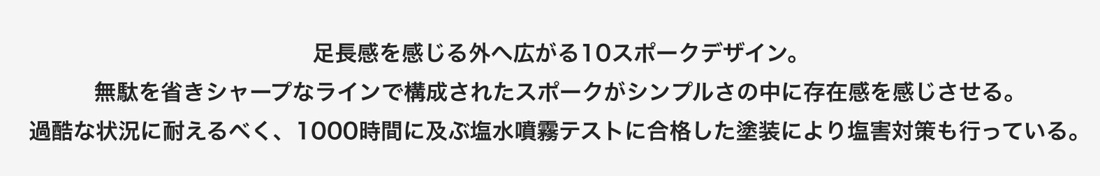 無駄を省きシャープなラインで構成されたスポークがシンプルさの中に存在感を感じさせる。