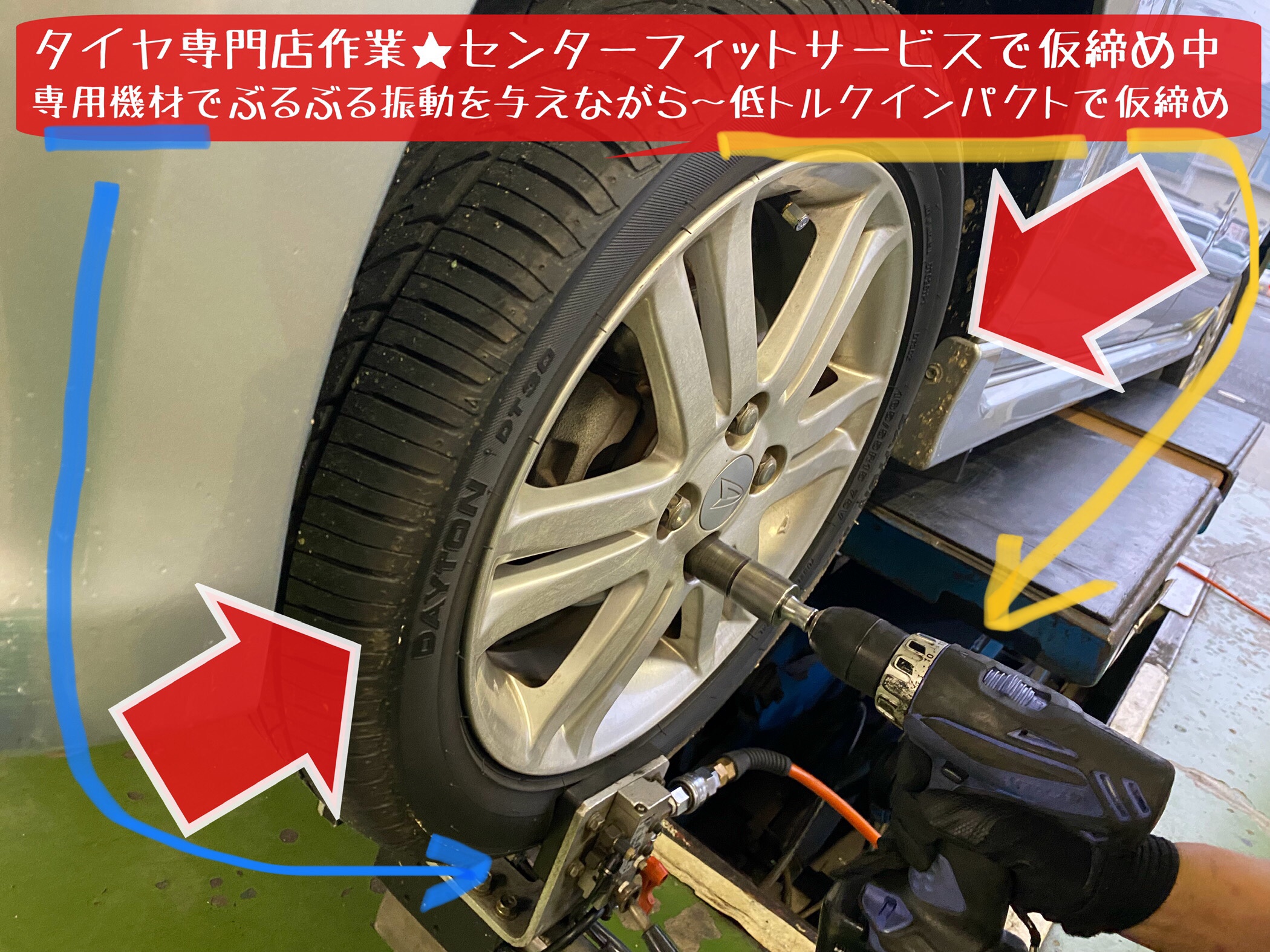 タイヤ専門店作業★センターフィットサービスで仮締め中